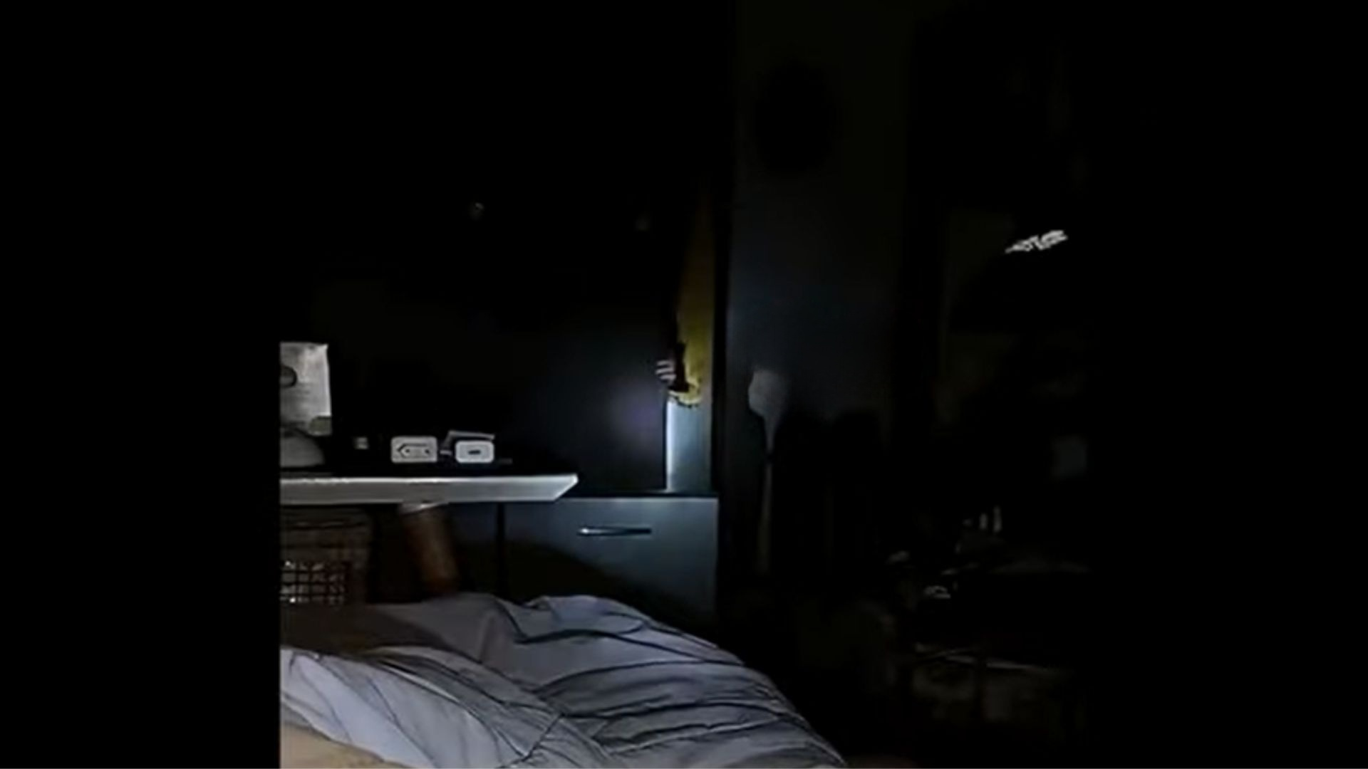 Cackling can be heard coming from the darkness. As the man shines his flashlight at his bedroom wardrobe, a hand can be seen reaching out. But when he goes to check, no one’s inside it. However, as he’s checking inside, a door slams behind him. He spins around, but nothing’s there. Then the sounds of someone or something screaming is heard.